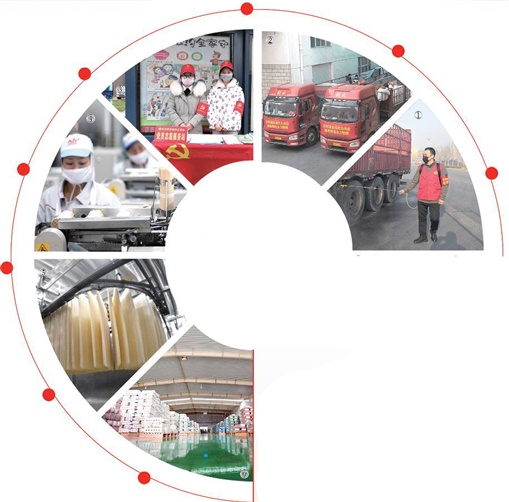 ①门岗对进入公司的货车消毒。。。。。。。②客栈大年头二最先发货。。。。。。。③党员自愿者组成服务队。。。。。。。④工厂车间生产一角。。。。。。。⑤自动化烘干生产线。。。。。。。⑥整齐…